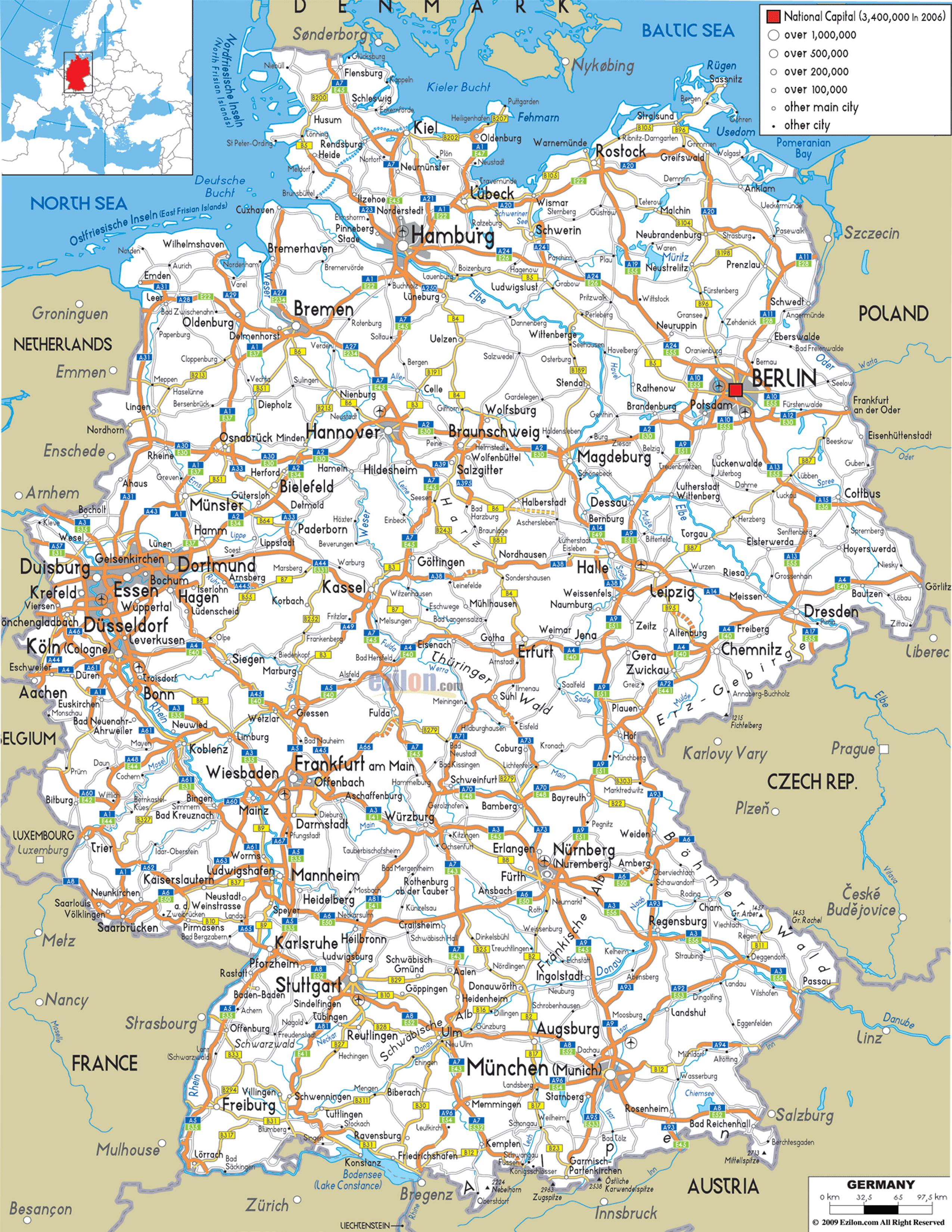 Mapa Niemiec transport. Niemcy transportowe karty (Europa Zachodnia - Europa) do druku. Niemcy transportowe karty (Europa Zachodnia - Europa) do pobrania. Niemcy, jako kraj gęsto zaludniony, położony w centralnej części Europy i posiadający rozwiniętą gospodarkę, mają gęstą i nowoczesną infrastrukturę transportową. Rozległa niemiecka sieć autostrad (Autobahn), będąca pierwszym systemem autostrad, słynie z odcinków, na których nie obowiązują ograniczenia prędkości. Najważniejszym szlakiem wodnym kraju jest rzeka Ren. Największym portem jest Hamburg. Lotnisko we Frankfurcie jest głównym międzynarodowym portem lotniczym i europejskim węzłem komunikacyjnym. Podróżowanie samolotem jest wykorzystywane na większe odległości w Niemczech, ale napotyka konkurencję ze strony państwowej sieci kolejowej Deutsche Bahn. Szybkie pociągi, zwane ICE, łączą miasta dla pasażerów, jak pokazano na mapie transportowej Niemiec. Wiele niemieckich miast posiada systemy szybkiego transportu, a transport publiczny jest dostępny w większości obszarów. Od czasu zjednoczenia Niemiec konieczne było podjęcie znacznych wysiłków w celu poprawy i rozbudowy infrastruktury transportowej na terenie dawnych Niemiec Wschodnich.