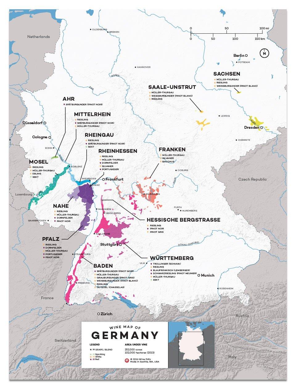 Wszystkie wina produkowane są wokół rzek, głównie Renu i jego dopływów, często osłoniętych górami. Rzeki mają znaczący wpływ na mikroklimat, który łagodzi temperaturę. Gleba jest łupkowa w stromych dolinach, aby wchłonąć ciepło słoneczne i zatrzymać je na noc. Na falistych wzgórzach gleba jest zdominowana przez wapno i glinę. Regiony winiarskie w Niemczech, o których zwykle się mówi, to 13 regionów określonych dla wina gatunkowego. Niemiecki przemysł winiarski zorganizował się wokół tych regionów i ich podziału na okręgi. Istnieje jednak również szereg regionów dla rzadko eksportowanych kategorii wina stołowego (Tafelwein) i wina wiejskiego (Landwein), jak widać na mapie win Niemiec. Regiony te, z kilkoma wyjątkami, pokrywają się z regionami win jakościowych. W celu wyraźnego rozróżnienia poziomów jakości, regiony i podregiony dla różnych poziomów jakości mają celowo różne nazwy, nawet jeśli są dopuszczone do produkcji na tym samym obszarze geograficznym.